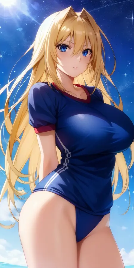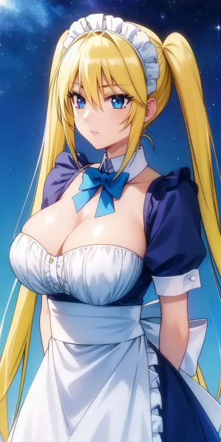 blue_short_dress_maid_headdress_detached_collar_waist_apron_blue_bowtie_puffy_short_sleeves_cleavage_white_back_bow: Her blue maid outfit.