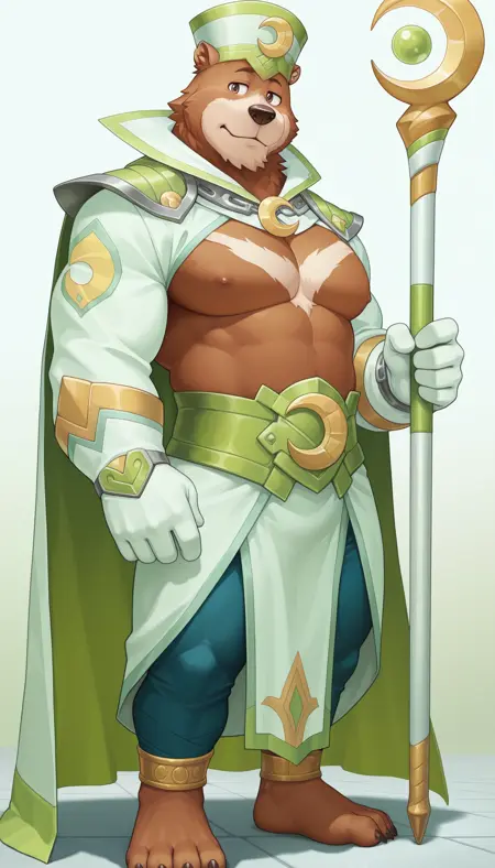 Robes: Main Outfit: green and white robes, green and white hat with crescent emblem, white collar, crescent moon staff, green and white shrug (clothing), blue knee-length pants, anklets, barefoot, white gloves, thick arms, thick legs,