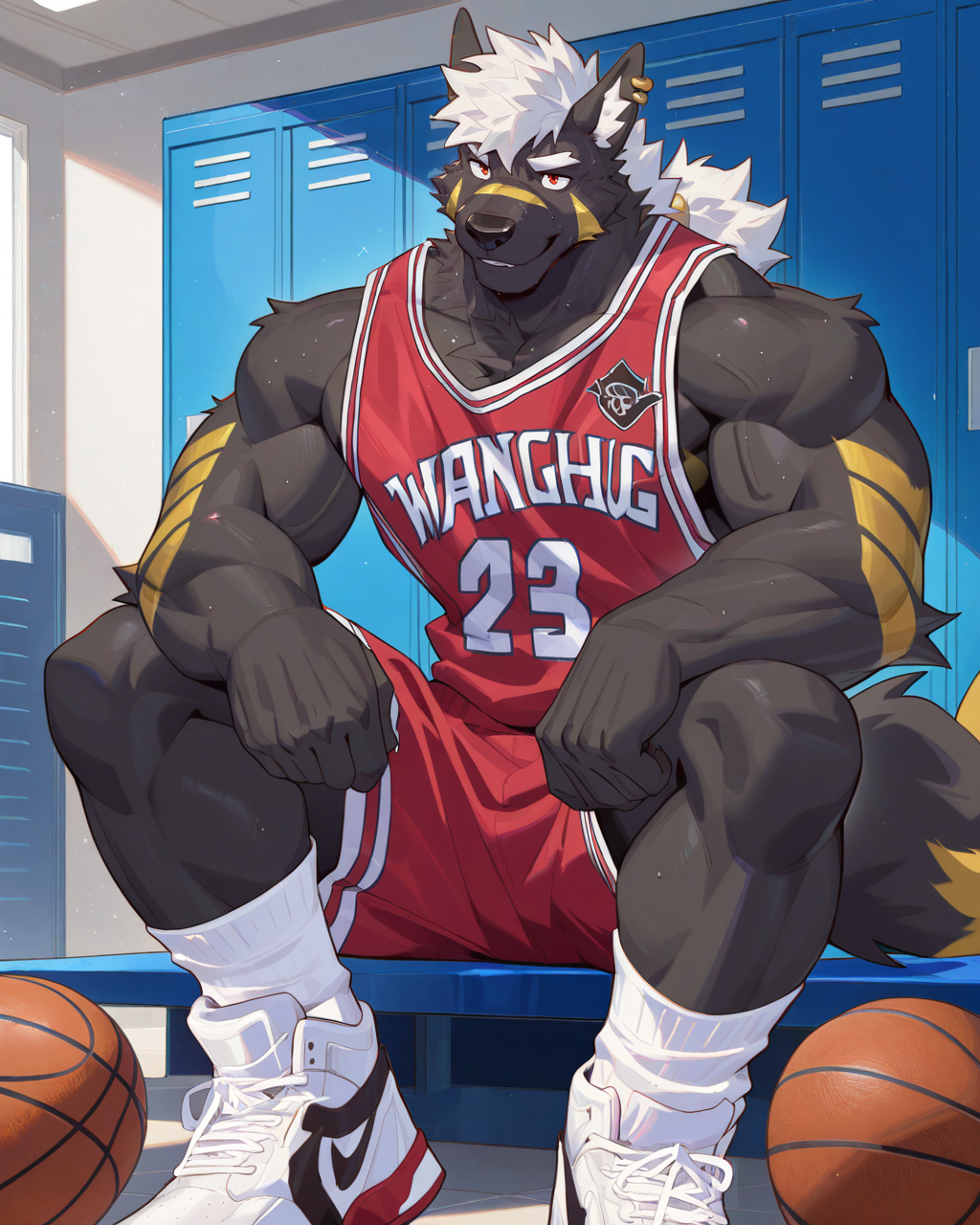 yellow markings, yellow facial markings, red eyes, ear rings, air jordan, white socks,