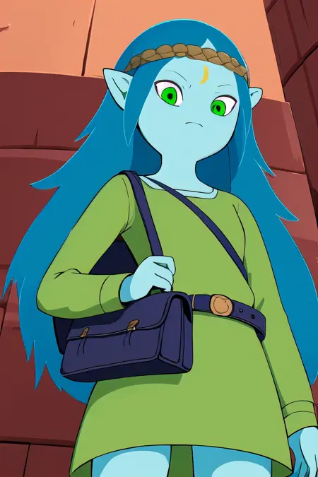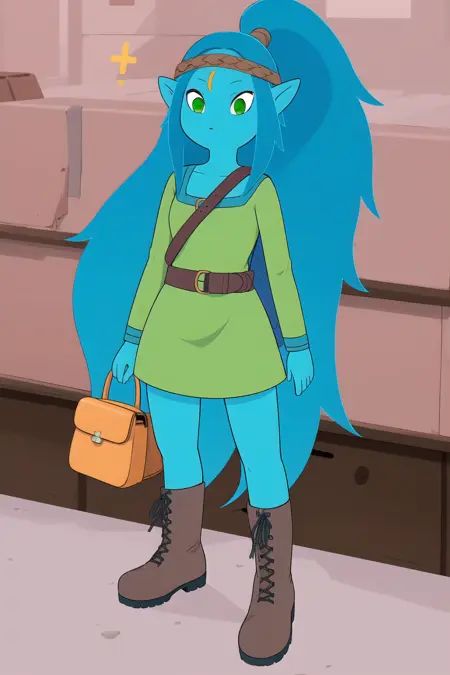 提示词:1girl, solo, long hair, dress, very long hair, blue hair, standing, boots, pointy ears, belt, bag, colored skin, green dress, blue skin, flat color