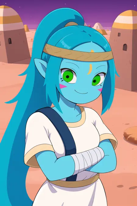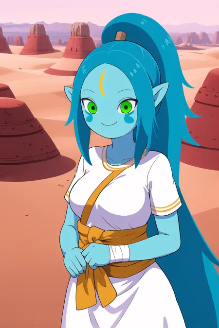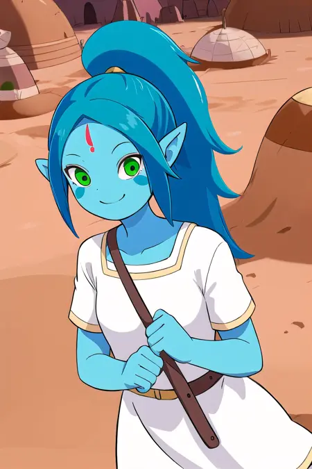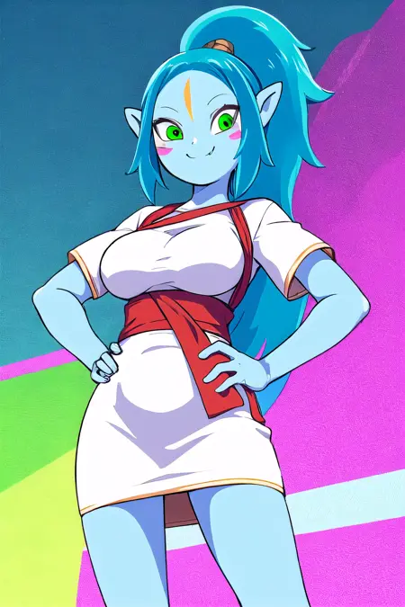 提示词:1girl, solo, long hair, dress, very long hair, green eyes, blue hair, standing, full body, ponytail, short sleeves, pointy ears, colored skin, sandals, blue skin, tunic