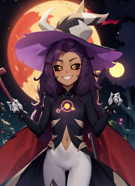 lora:LuzNocedaTitan-10:0.85, LuzNocedaTitan, 1girl, yellow eyes, black headwear, smile, hat, black hat, witch hat, purple hair, smile, solo, brown skin, black sclera, dark, solo, staff, styleThwlhs, horns, fangs, covered skin, covered legs, upper body, covered body, covered navel, white legging