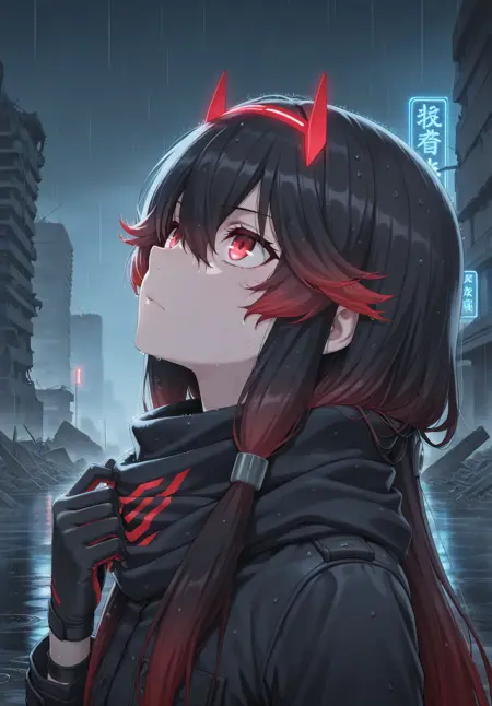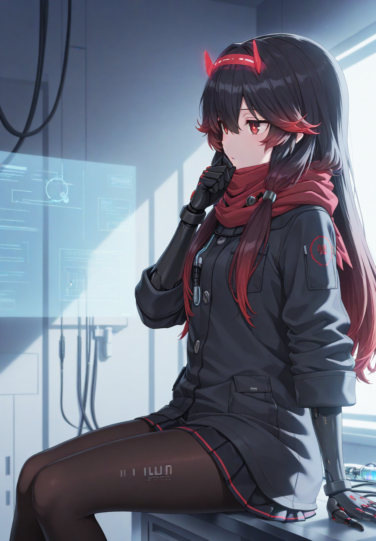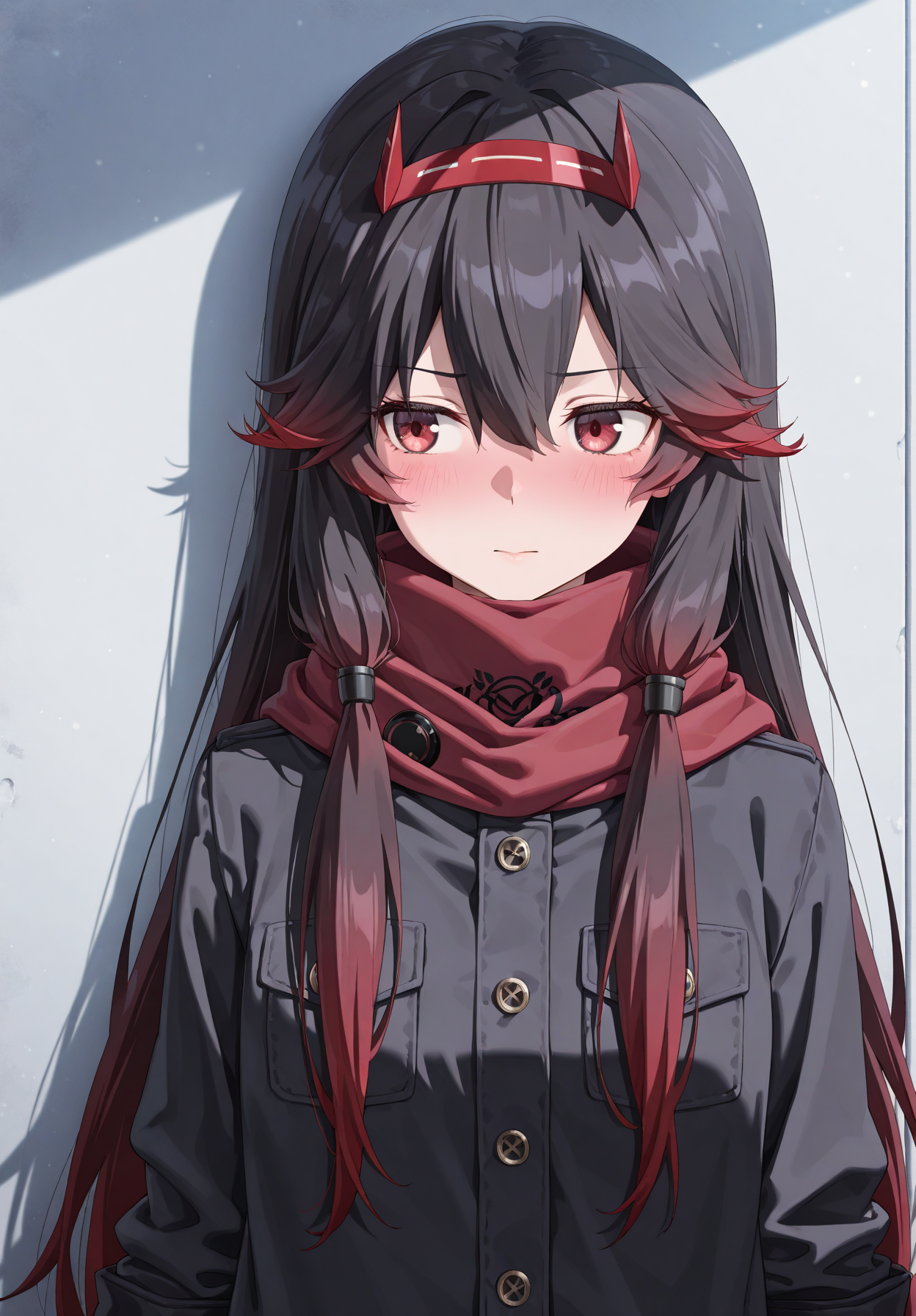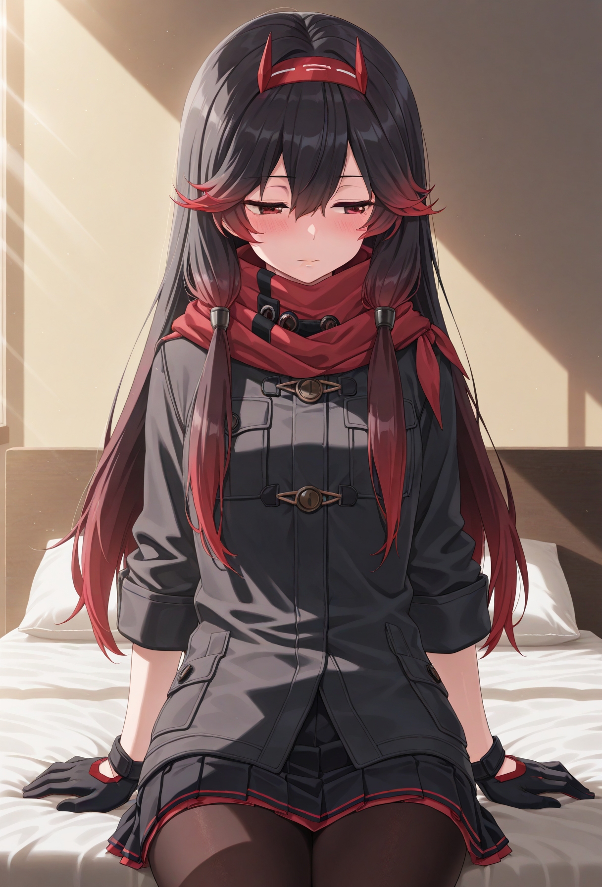 1girl, gradient hair, black hair, hair between eyes, black gloves, red hair, red eyes, bangs, red scarf, black skirt, dark pantyhose,