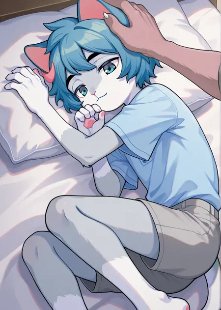 트리거 단어: sima, solo, 1boy, 고양이 귀, 파란 머리카락, 빨간 줄무늬, 파란 눈, 고양이 소년, 파란 피부색, 퓨리, 파란 셔츠, 회색 반바지