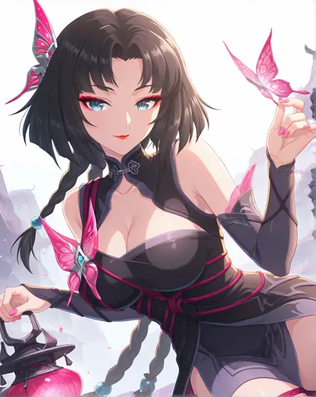 프롬프트: Zhuxin-Liver020, 1girl, solo, short hair, long hair, black hair, blue eyes, large breasts, bare shoulders, braid, twin braids, hair ornament, dress, black dress, clothing cutout, cleavage cutout, detached sleeves, holding lantern, thigh strap, butterfly, lantern, makeup, lipstick, eyeshadow, red lips, pink nails, nail polish, rope, japanese clothes, chinese clothes, bridal gauntlets