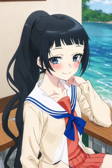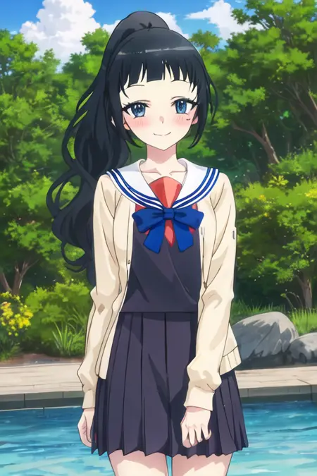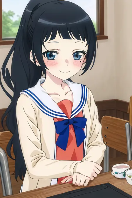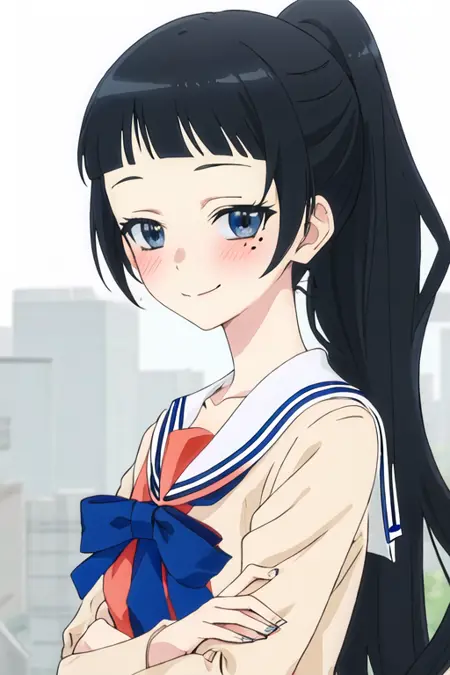 The trigger word is chiyo_4ninwasorezoreusootsuku, and the recommended tags are best quality, masterpiece, highres, solo, {chiyo_4ninwasorezoreusootsuku:1.15}, black_hair, long_hair, blush, bangs, mole, mole_under_eye, blunt_bangs, smile, blue_eyes, serafuku, ponytail.