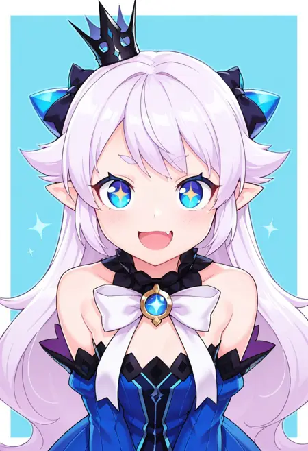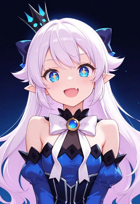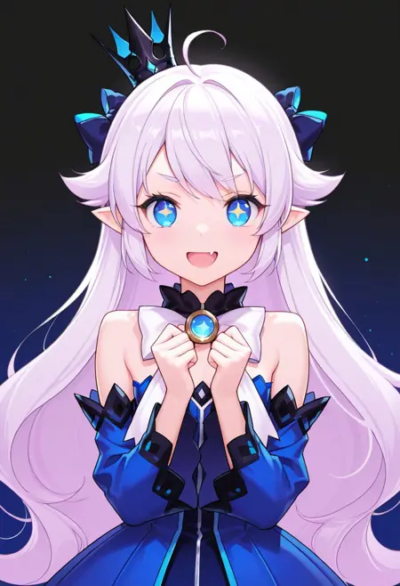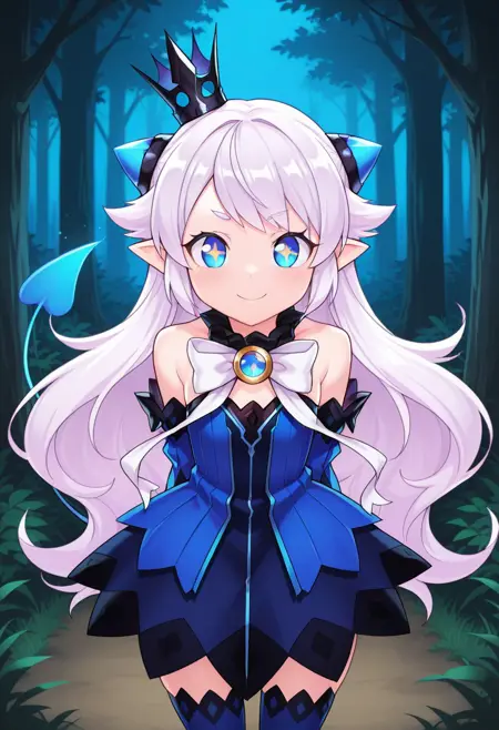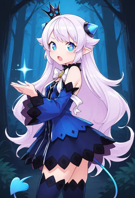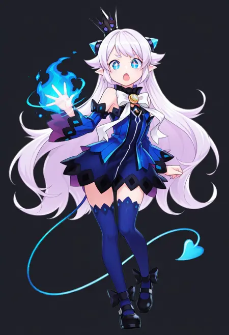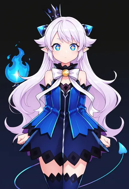 1 girl, ElsLuBase, 角, lubase 角, 白发, 长发, 蓝眼, lu 眼, + +, 符号形瞳孔, 尖耳, 小皇冠, LuBase 蝴蝶结, 白色蝴蝶结, 胸针, LuBase 连衣裙, 蓝色连衣裙, 分离袖子, lubase 袖子, 蓝色袖子, lubase 长筒袜, 蓝色长筒袜, lubase 尾巴, 恶魔尾巴, luBase 鞋子, 黑色鞋子