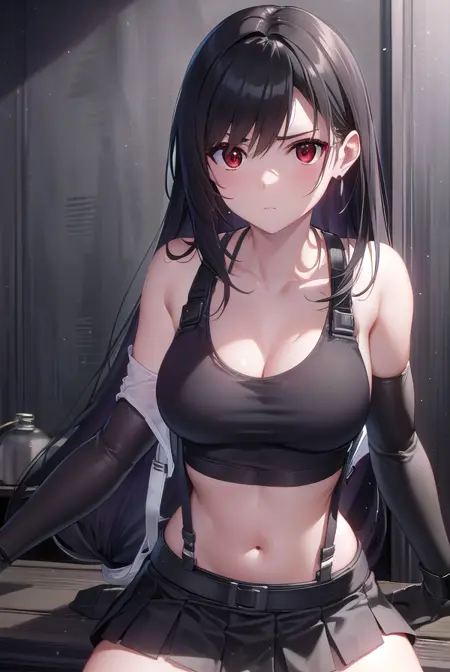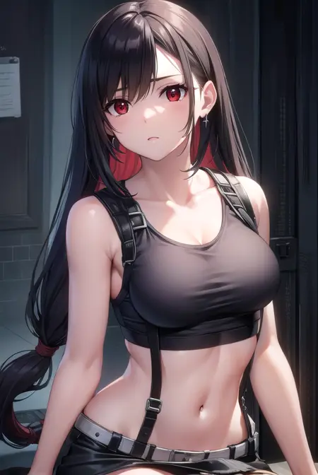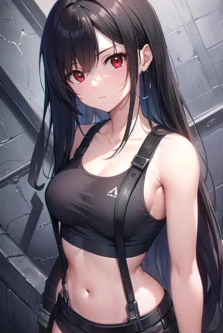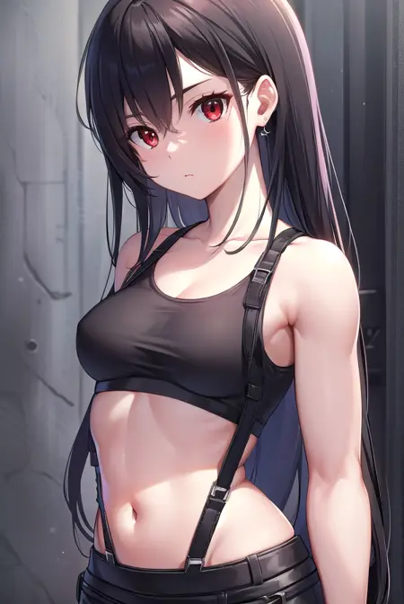 蒂法·洛克哈特,黑发,长发,(低扎长发:1.5),(红眼:1.5),侧分刘海,单侧发辫,