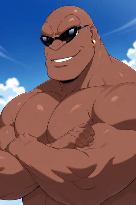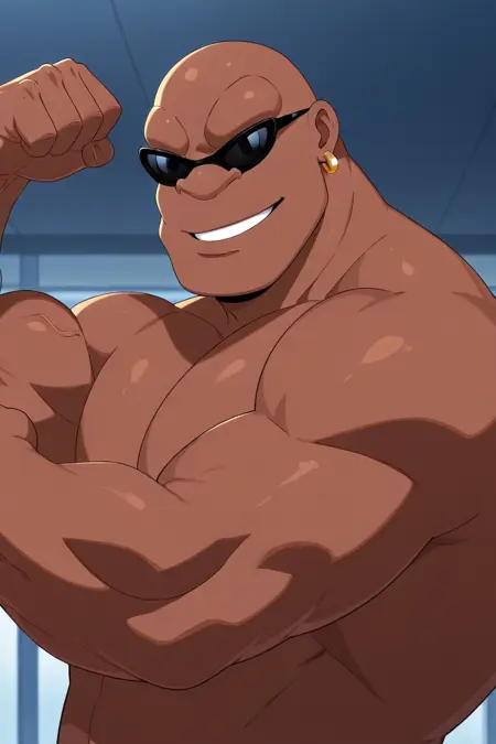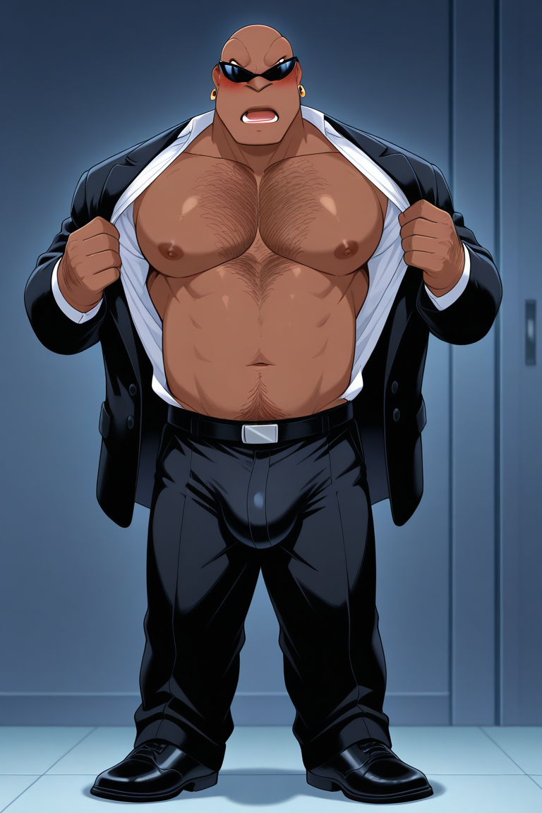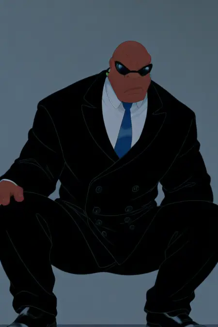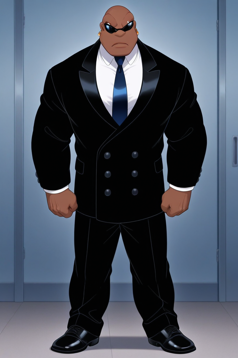 | トレーニングワード | Cobra Bubbles, solo, male, adult, brown skin, black eyes, no eyebrows, earring in right ear, dark sunglasses, blue tie, formal black suit, double-breasted jacket, wide pointed lapels, white shirt, classic collar, black pants, black shoesコピーしました! |