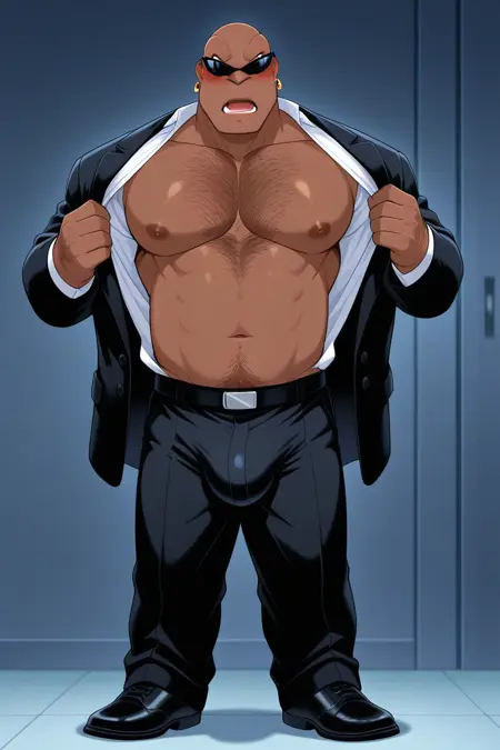 Cobra Bubbles, solo, male, adult, brown skin, black eyes, no eyebrows, earring in right ear, dark sunglasses, blue tie, formal black suit, double-breasted jacket, wide pointed lapels, white shirt, classic collar, black pants, black shoes