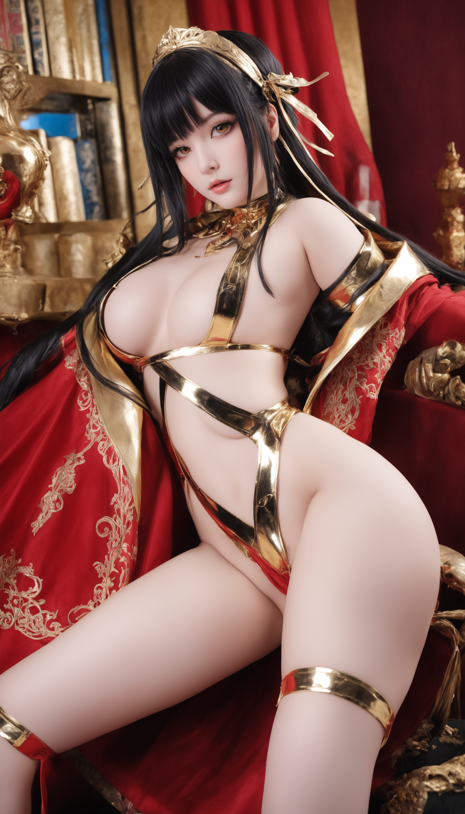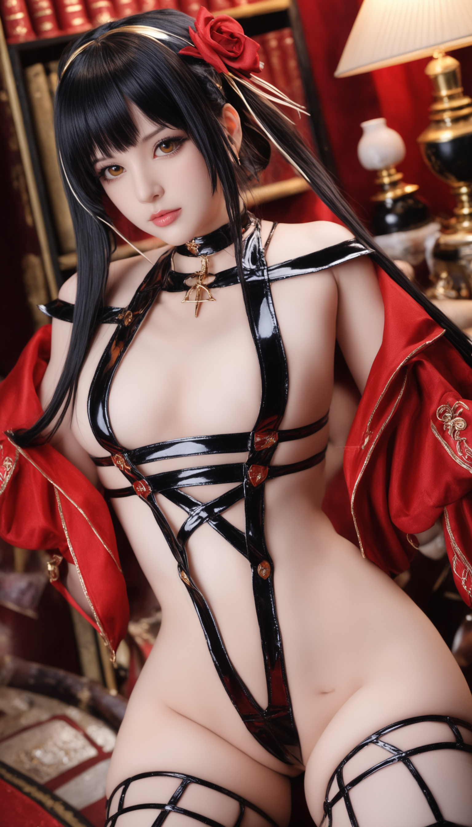 mimi chan, Yor Forger, masterpiece, best illustration, realistic, best quality, ultra detailed, beautiful details, 8k, 1girl, large breasts, black hair, lips, long hair, hairband, red eyes, skindentation, hair flower