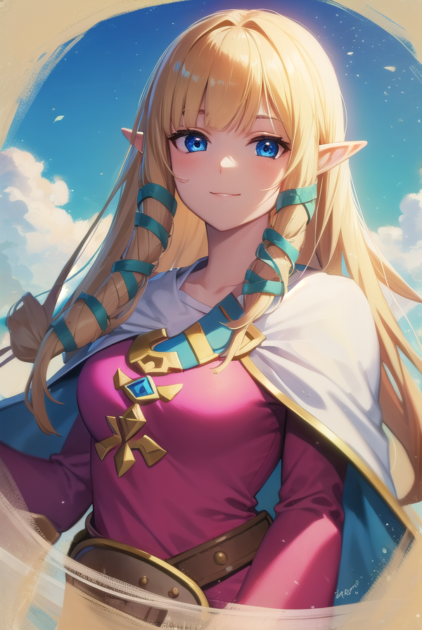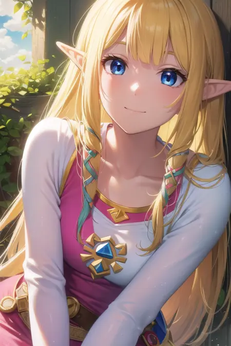 princess zelda, blonde hair, (green eyes:1.5), pointy ears, long hair, parted bangs,