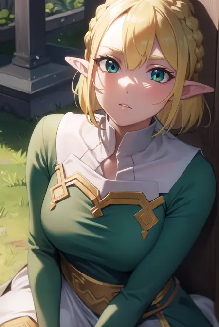 princess zelda, blonde hair, (green eyes:1.5), pointy ears, hair ornament, hairclip, parted bangs, short hair, crown braid,