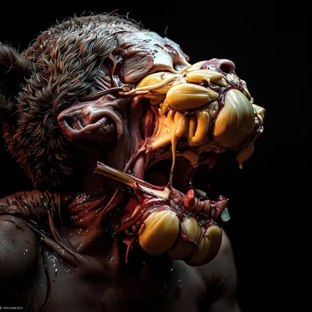 "아름다운 여성이 크론버그식 혼합 공포로 전환되는 고통스러운 변형을 촬영한 시네마틱 마크로 사진. 그녀의 형태는 악몽 같은 문어의 왜곡된 모습을 연상시키는 공포 요소와 생생하게 융합됩니다. 극적인 명암이 장면을 조각하며, 절대적인 검은 그림자가 고통받는 인물의 대부분을 집어삼켜 심리적 공포를 극대화합니다. 거칠고 잔혹한 빛이 역동적으로 비틀린 인체의 형태를 가로지르며, 공포스러운 융합이 일어나는 부위를 드러냅니다: 그녀의 등은 불가능하게 휘어지고, 몸통이 열리며, 장기 대신 떠오르는 반짝이는 연한 노란색, 퓨플리한 파파야 과육과 실처럼 뻗은 연한 섬유가 드러납니다. 그녀의 팔다리는 비틀리고 돌연변이를 일으켜 일부는 융합된 촉수 같은 부속체로 길어지고, 벗겨진 피부 아래에서 같은 점성적이고 섬유질의 노란 퓨플이 솟아납니다. 일부 지역에서는 이 퓨플이 더 거친 갈색, 썩어가는 퓨플로 변해 과일의 핵을 닮아 부패의 층을 더합니다. 그녀의 피부에 남아 있는 일부 영역에는 이상하고 병적인 무늬가 파동하며, 융합 부위와 찢어진 과육에서 점성적인 투명하거나 우유 같은 액체가 흘러나옵니다. 미세한 습윤 하이라이트가 퓨플리한 노란 덩어리, 실처럼 뻗은 흰 섬유, 또는 침투하는 육질의 성장에 의해 복원되는 그녀의 인간적 특징의 파편에 반짝임을 캡처합니다. 극한의 확대, 얕은 심도가 공포스러운 디테일을 고립시킵니다—예를 들어, 반짝이는 노란 퓨플과 연한 섬유로 이루어진 촉수가 찢어진 어깨와 비극적으로 융합되는 장면. 명확히 여성의 형태가 침범당하고, cephalopod의 괴물과 병리학적 파파야 텍스처와 구조적으로 융합되었습니다. 생생하고 혼란스럽고 혈액이 흐르는. 미세한 빈티지 필름 그레인, 비채도 팔레트."