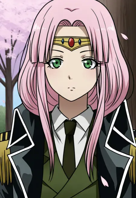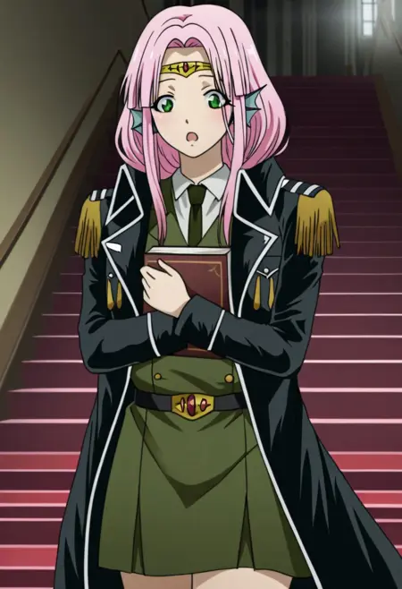 laymia, 녹색 눈, 분홍색 머리, 긴 머리, 유니폼, 군복, 코트, 망막 귀.