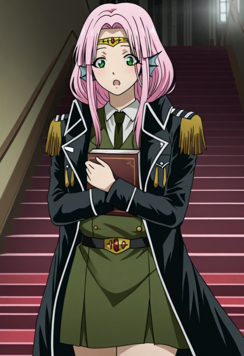 laymia, 緑の目, ピンクの髪, 長い髪, ユニフォーム, 軍服, コート, 爪状の耳