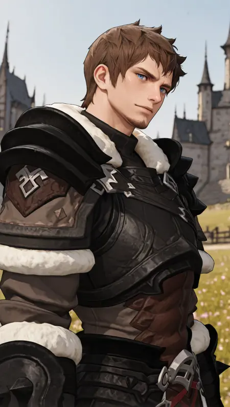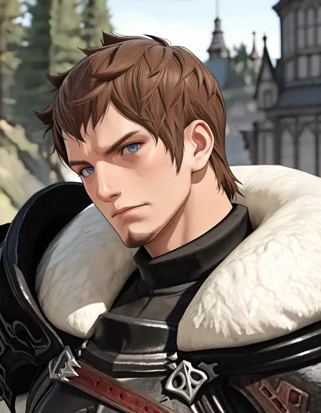 ardbert_ffxiv, 1boy, mature male, short hair, brown hair, blue eyes, goatee