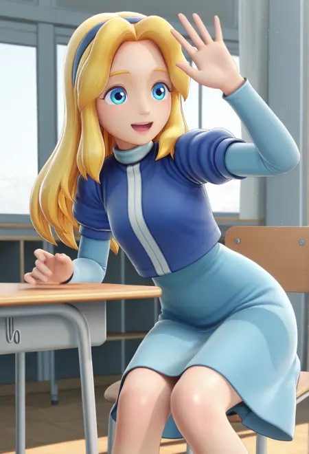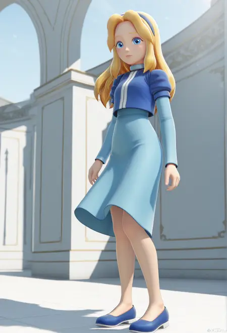 推奨プロンプト: sxsgmaria_robotnik、長い髪、金髪、青いヘアバンド、青い目、青いドレス、ふくらはぎの袖、中丈のスカート、靴、青い靴履き