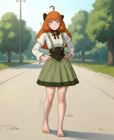 Appearance: P3nny, 1girl, orange hair, ahoge, green eyes, freckles