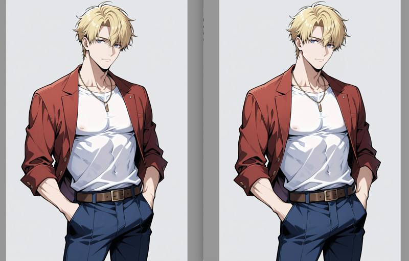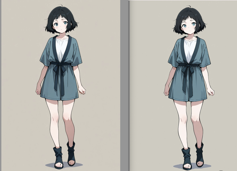 しかし、後になって、高解像度設定(highres fix)または img2img で拡大することで、画像のマクロ的な品質が明らかに向上することに気づきました。特にキャラクターが小さい場合、以下のような違いが見られます(左は拡大・縮小をしないもの):