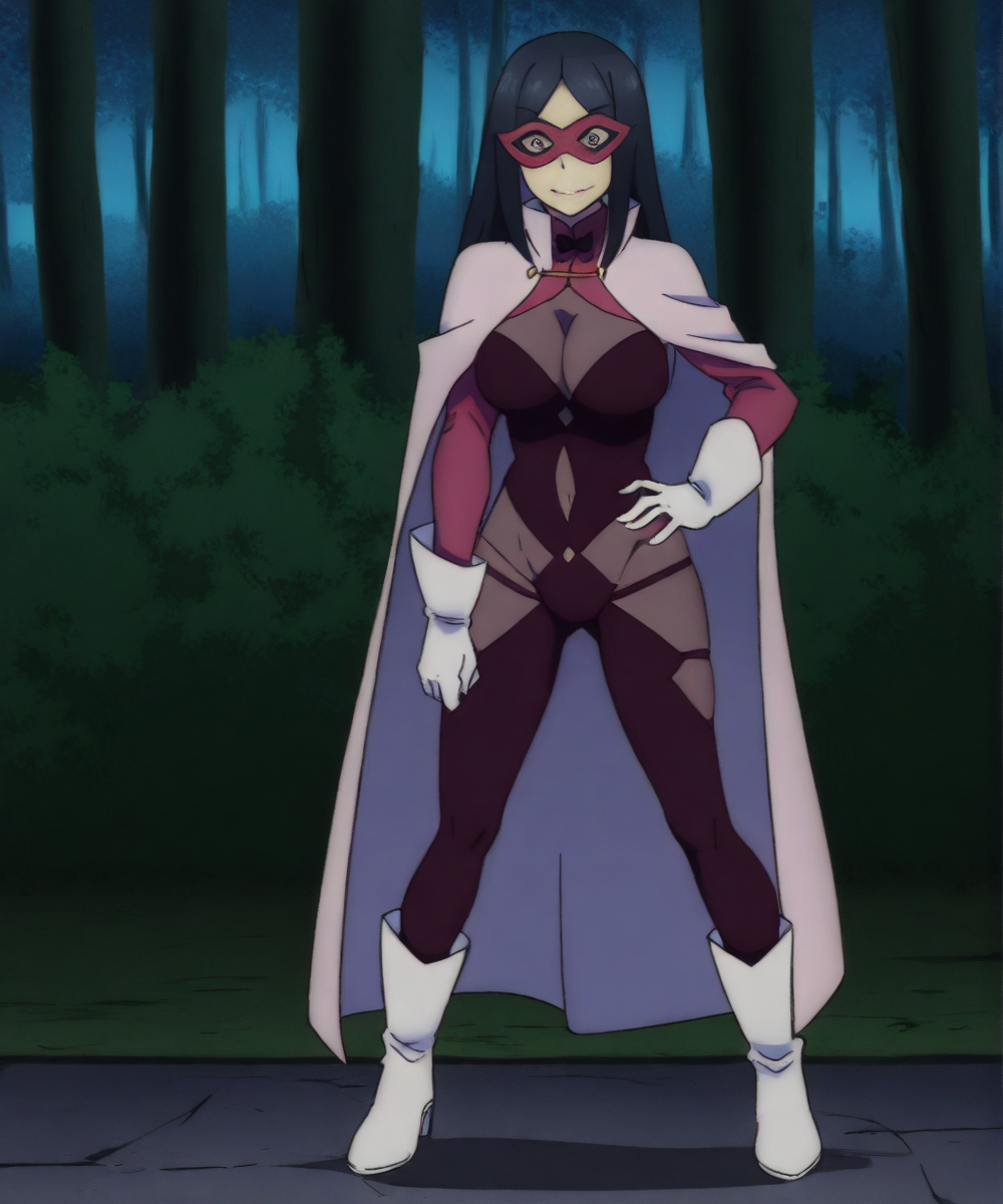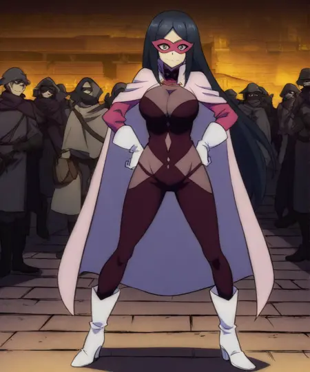 evilyphanbertholda, 1girl, solo, black hair, long hair, mask, cape, gloves, breasts, cleavage, boots, large breasts, bodysuit