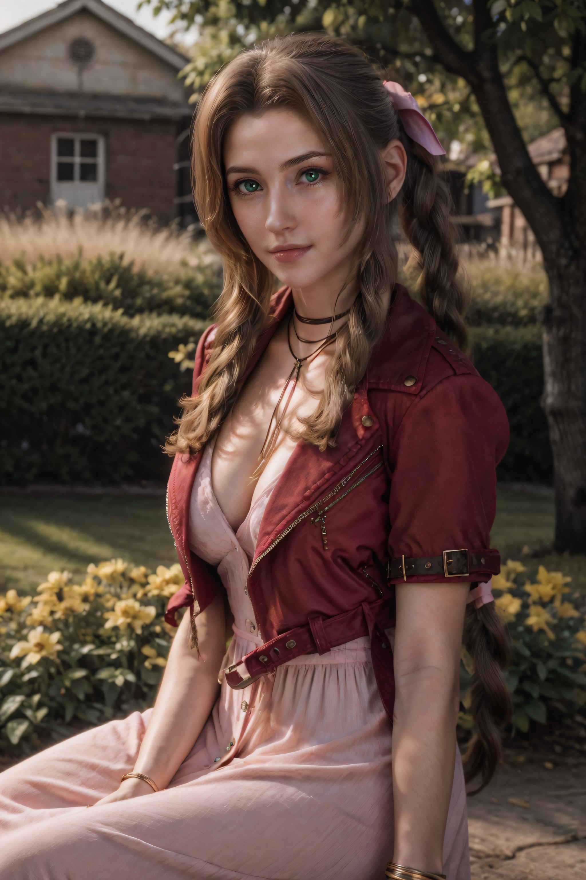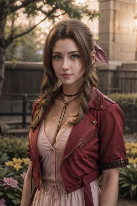 SD 포지티브 프롬프트: LORA, realistic, masterpiece, realistic, detailed, 8k, 1girl, (beautiful photography of aerith gainsborough, 18yo, brown hair, green eyes, long hair, hair ribbon, choker, braid, sidelocks, parted bangs, braided ponytail, necklace, side drill, collarbone, hair bow, red jacket, pink dress, long dress, open jacket, cropped jacket, short sleeves, bracelet, pink bow, large breasts, cleavage, pink ribbon, bangle, belt, buttons),..