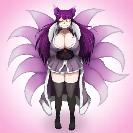 dajikit,多条尾巴,怪物女孩,狐狸耳朵,狐妖,动物耳朵,紫色头发,竖瞳,黄眼睛,长发,狐妖,尾巴,大胸部,尖牙,黑色过膝长筒袜,面部纹身