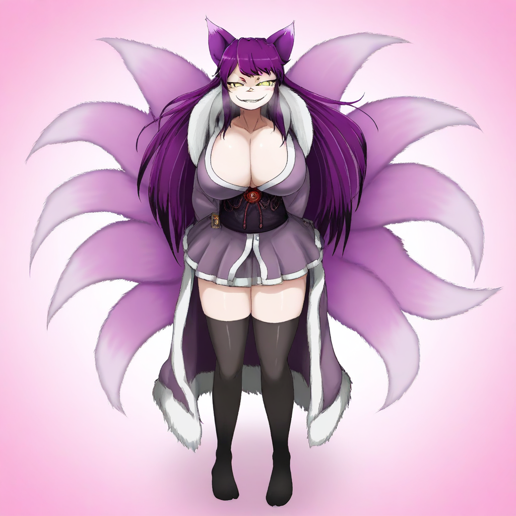 dajikit、複数の尾、モンスターガール、キツネの耳、キツネ娘、動物の耳、紫髪、縦に細い瞳、黄色い目、長い髪、キツネ、尾、大きな胸、牙、黒い太ももハイソックス、顔の模様