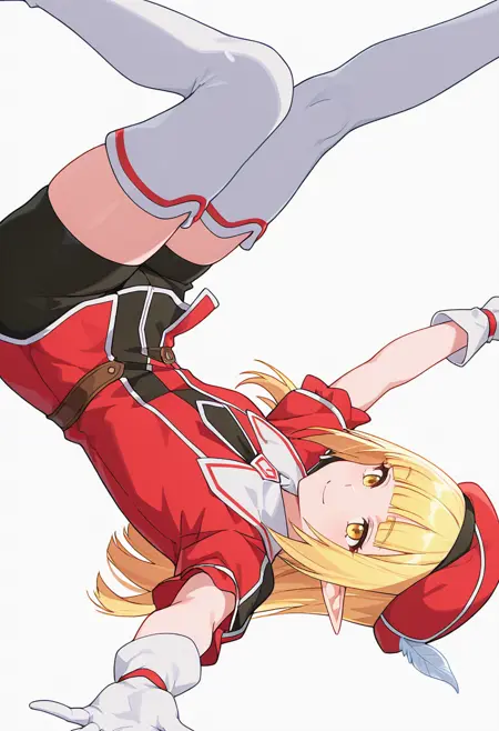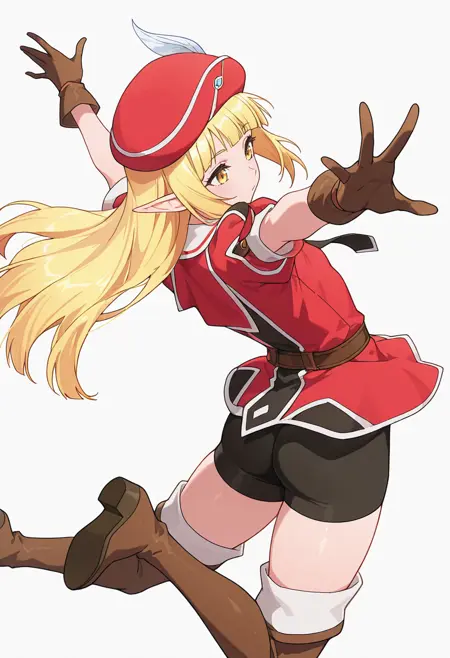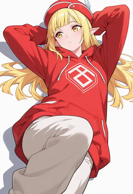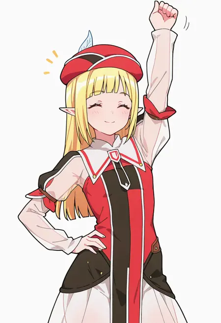 rune_cnr, 尖った耳, 金髪, 長髪, 黄色い目, まっすぐな前髪, エルフ, 赤い帽子, 帽子の羽,