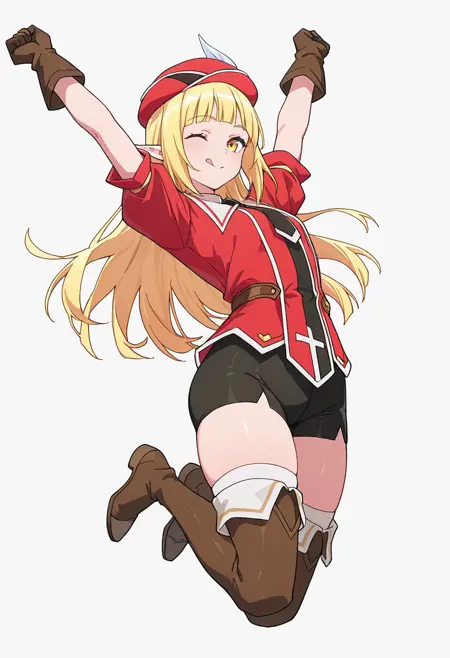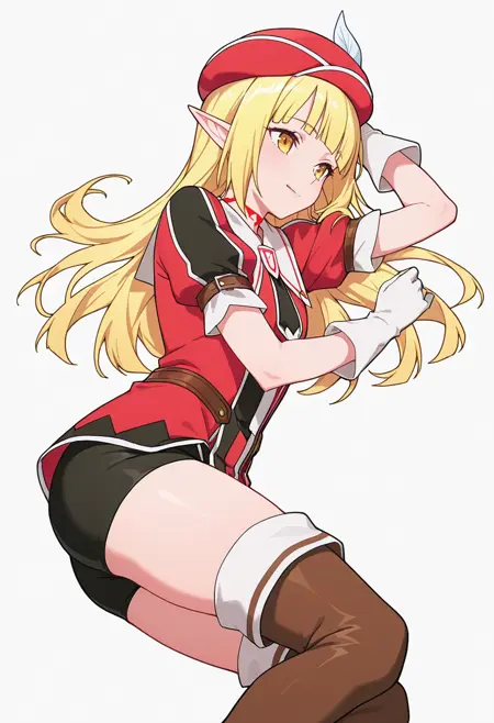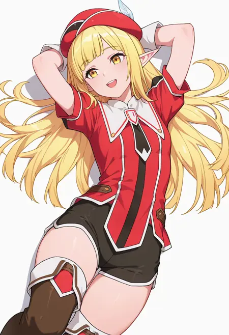 rune_cnr, 尖った耳, 金髪, 長髪, 黄色い目, まっすぐな前髪, エルフ, 赤い帽子, 帽子の羽,