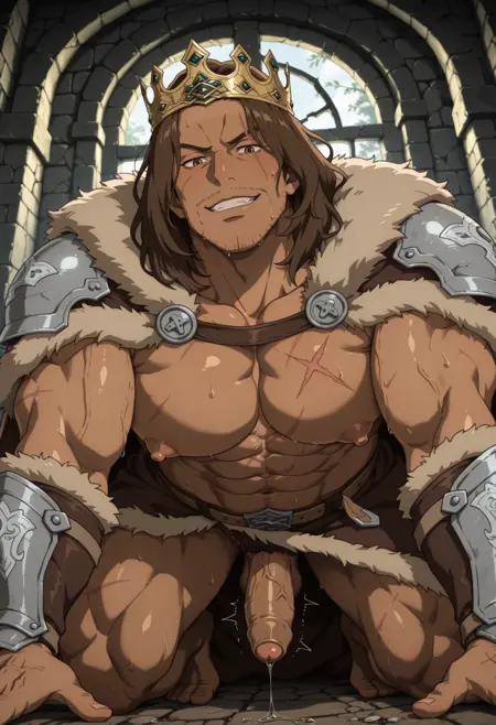 Wulf, Brown hair, brown eyes, dark skin, stubble, medium hair, Messy Tousled, scar on face, crown,