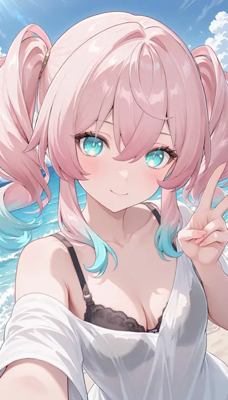 頭:tj_hyacine、赤い帽子、頭飾り、ピンクの髪、ツインテール、複色の髪、グラデーションの髪、長い髪、青い髪、横髪、目の間の髪、アイボリーの瞳、