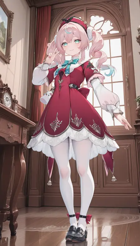 옷: 드레스, 긴 소매, 팬티스타킹, 흰색 팬티스타킹, 리본, 빨간 드레스, 풀풀한 소매, 풀풀한 긴 소매, 넥타이, 신발, 검은 신발,