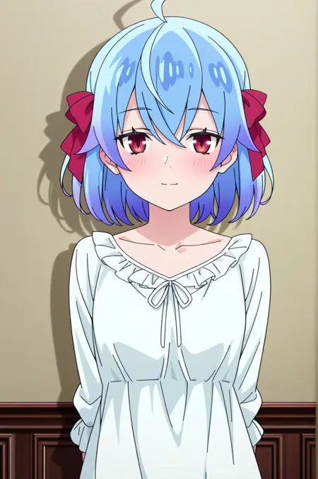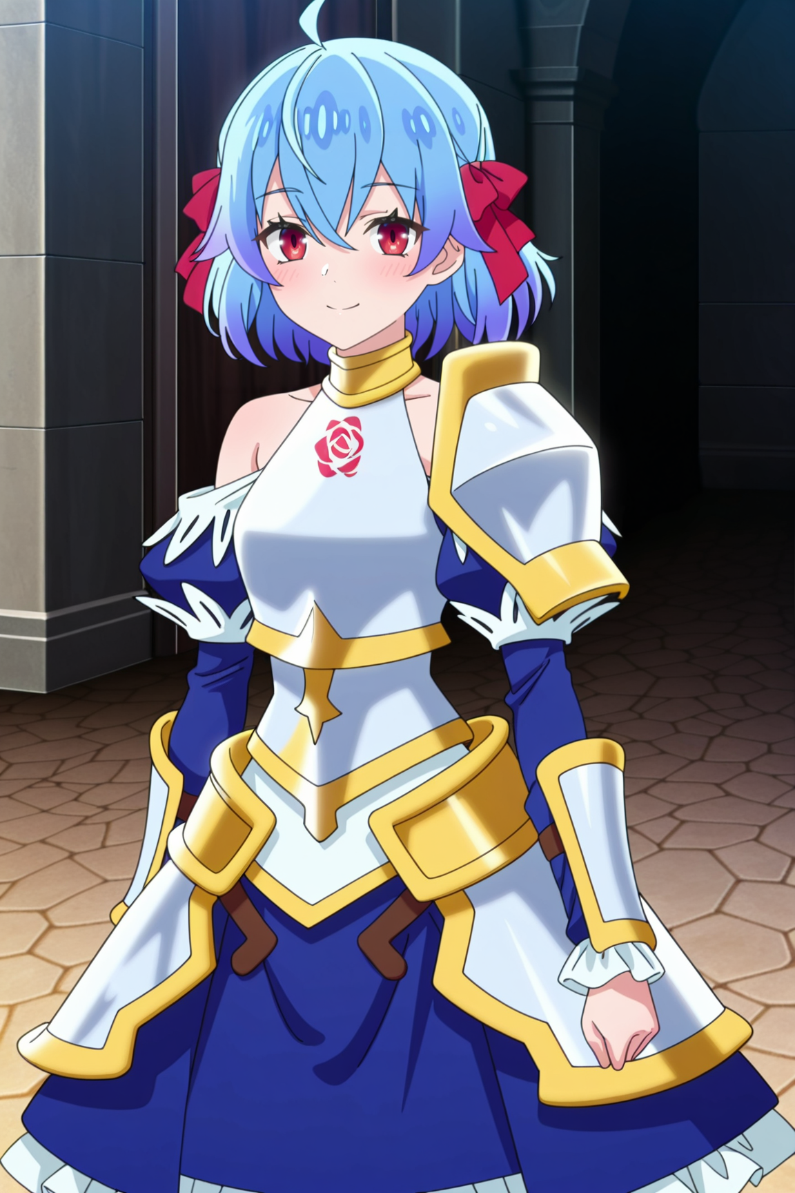 1girl, ruti ragnason, shin no nakama, red eyes, blue hair, ahoge, short hair, hair bow, red bow,