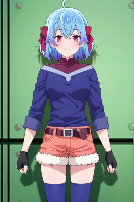 ruticasu, blue shirt, gloves, orange shorts, fur-trimmed shorts, belt, blue thighhighs, fingerless gloves,