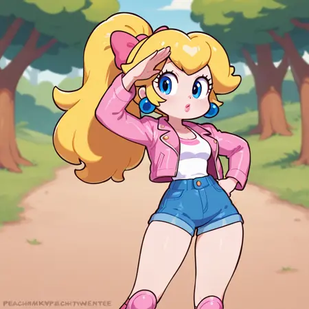 推奨キーワード: デニムショートパンツ、ピンクのジャケット、ヒザパッド