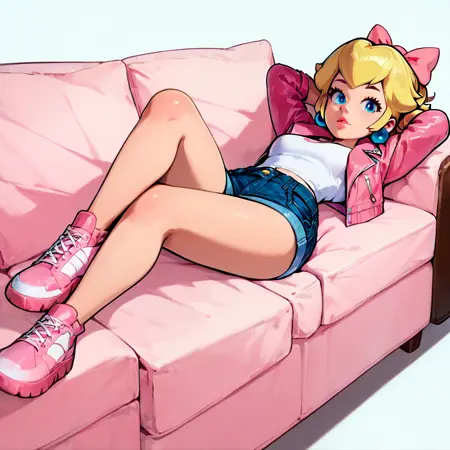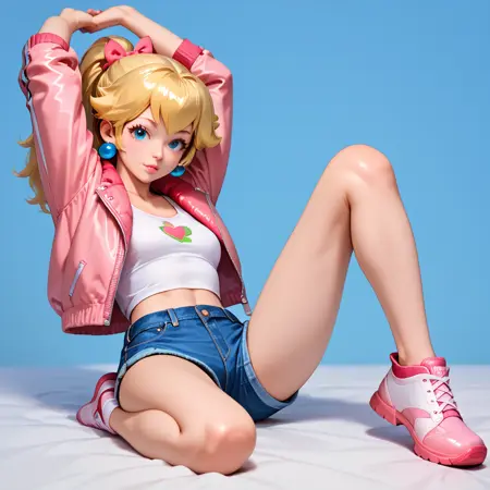 推奨キーワード: デニムショートパンツ、ピンクのジャケット、ヒザパッド