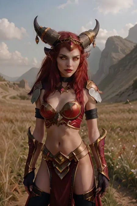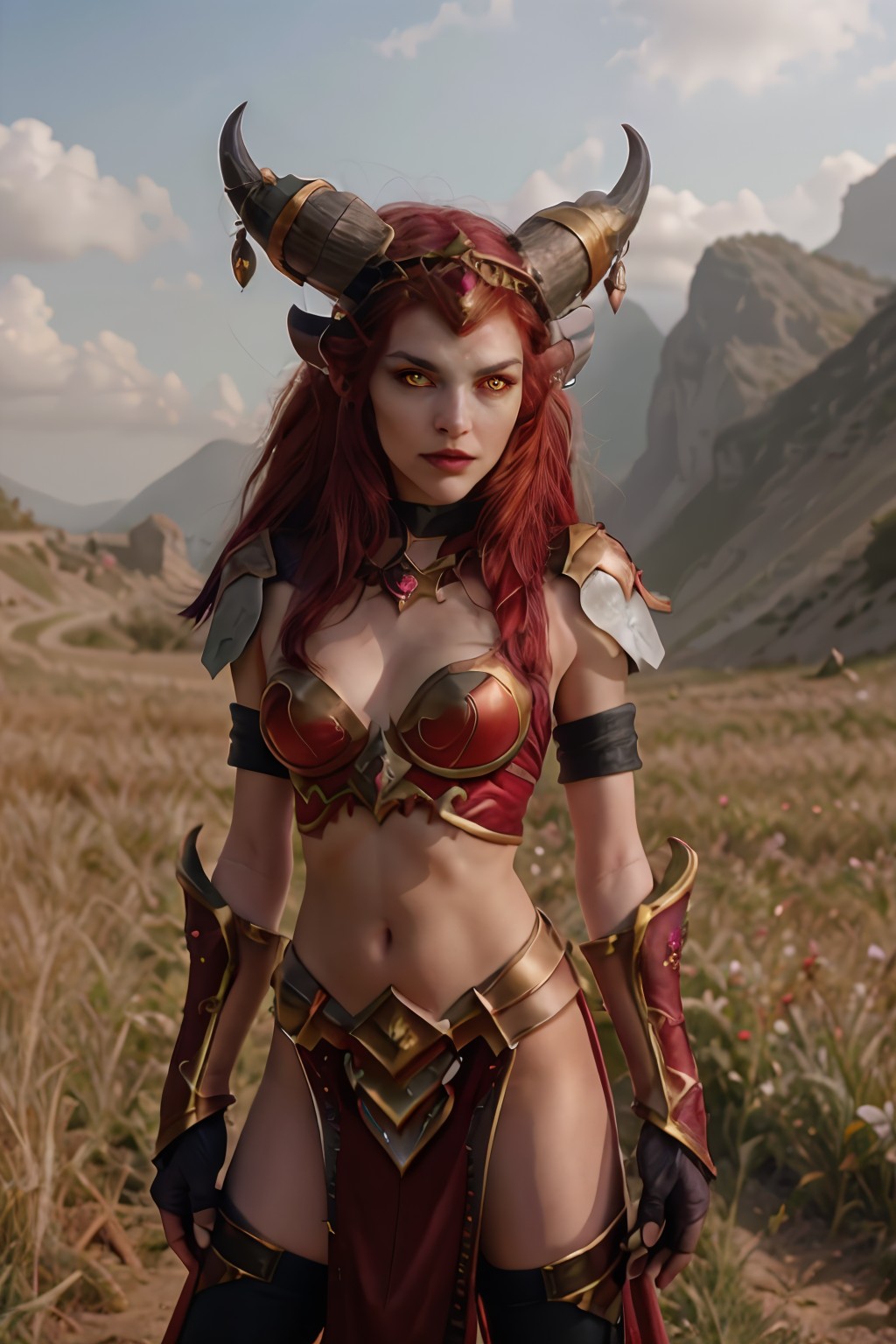 Alexstrasza, 빨간 머리, 황금색 눈, 뿔, 긴 눈썹, 헤드리스, 날씬한 몸매