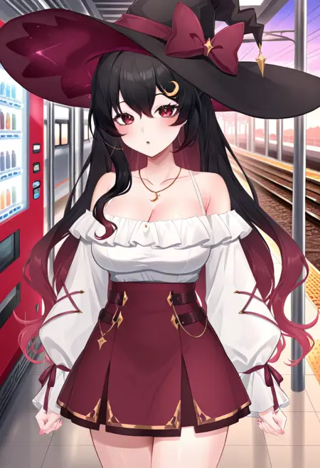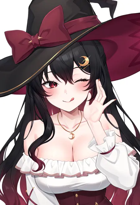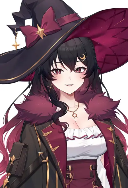 服装提示: 女巫帽,帽结,黑色头饰,白衬衫,新月形发饰,项链,新月,红裙,不对称裤装,不均匀裤装