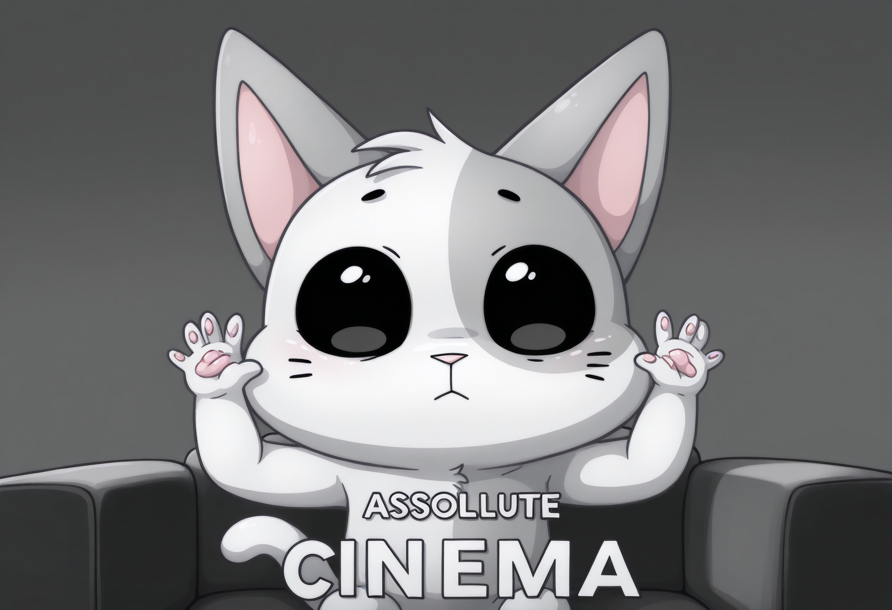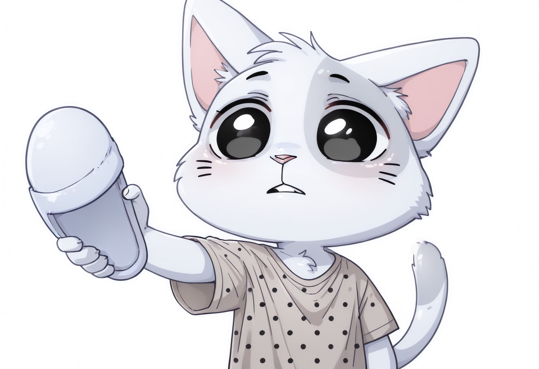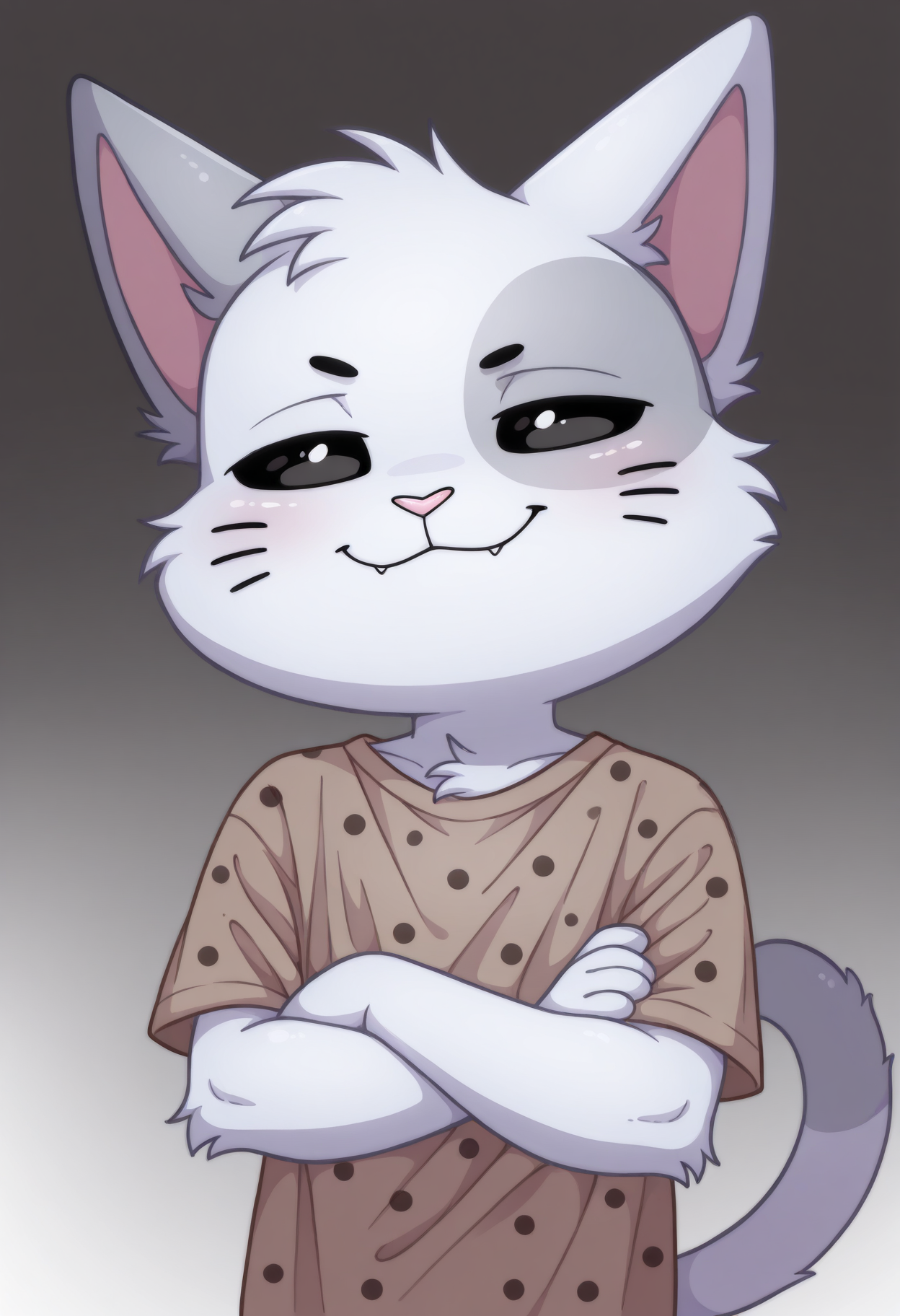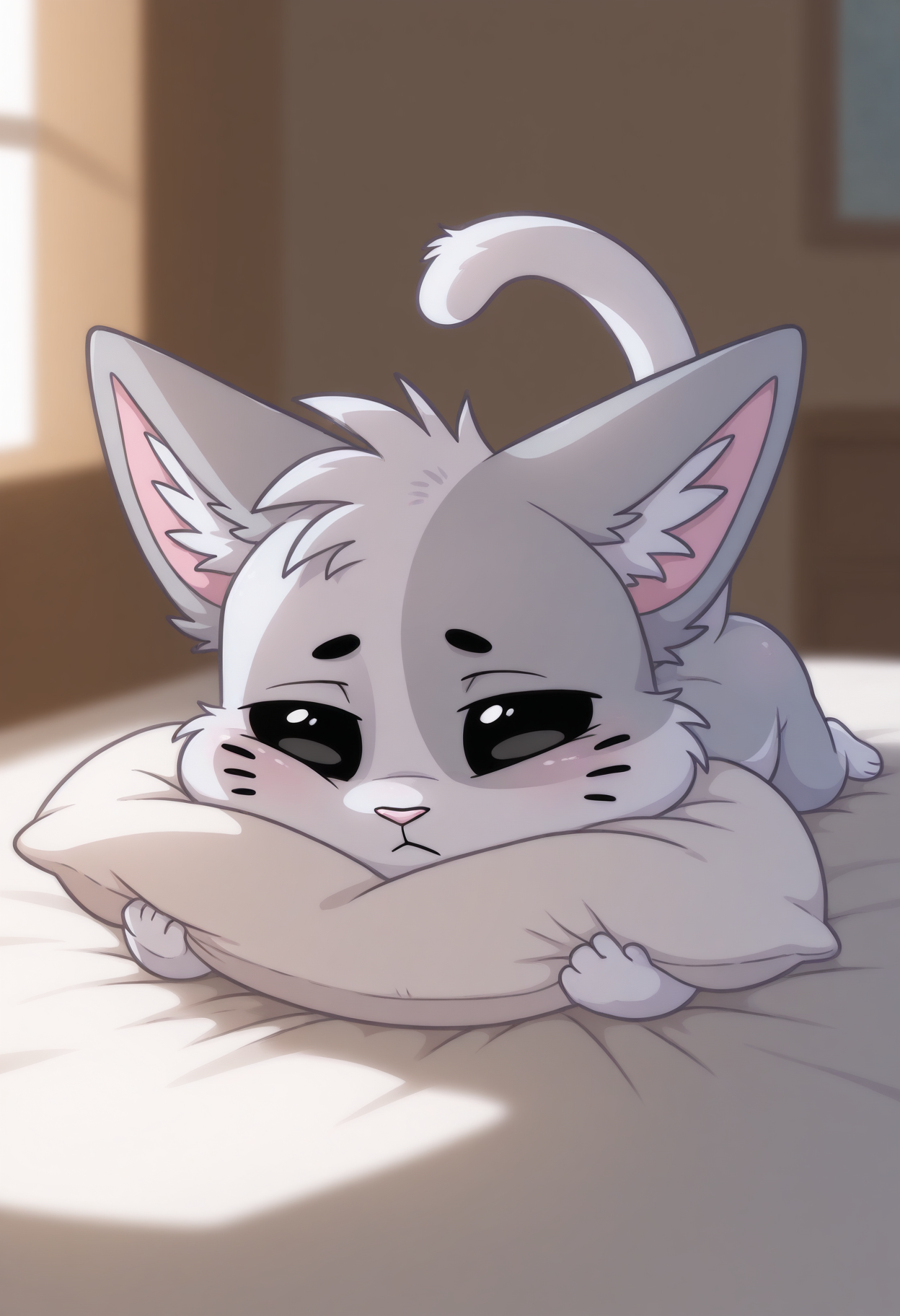 프롬프트: B1scu1t-vkstickrs, 은색 털, 수컷, 치비, 고양이 꼬리, 작은 분홍 코, 왼쪽 눈 위 회색 원형 무늬