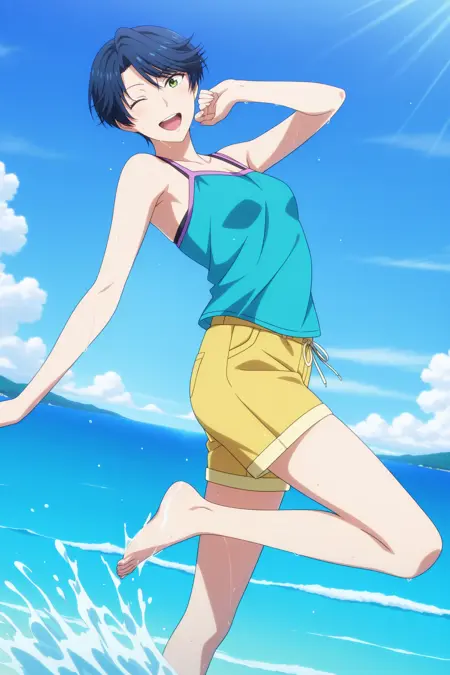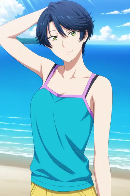 kashima yuu, 단발머리, 파란 머리, 갈라진 앞머리, 녹색 눈, 소매 없음, 에어카미솔, 검은 비키니 상의, 노란 반바지