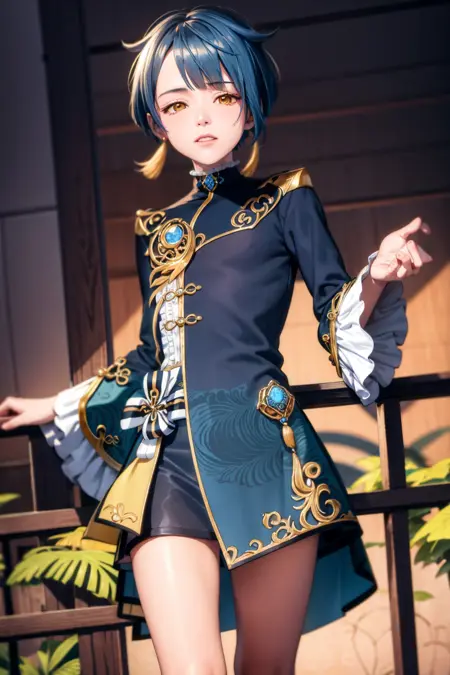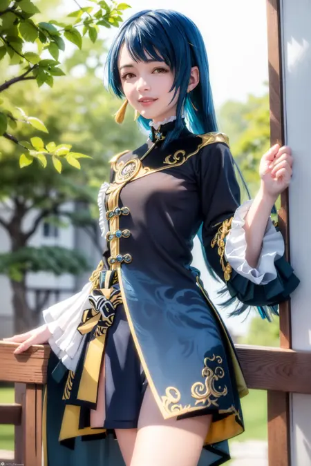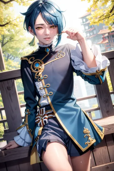 行秋(原神)、1人の男性、男性中心、ソロ、ジュエリー、青い髪、イヤリング、フリルの袖、黄色い目、片方のイヤリング、フリル、観客を見る、長い袖、水、前髪、タッセルのイヤリング、タッセル