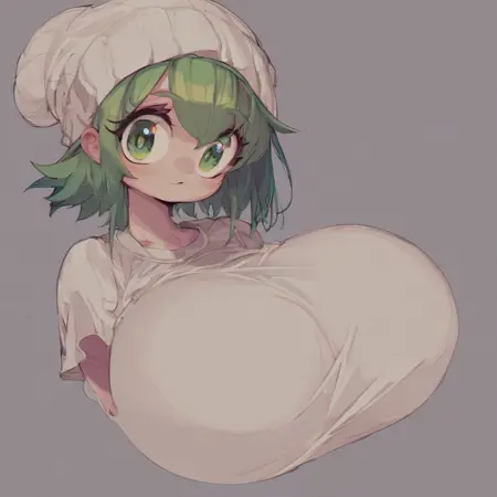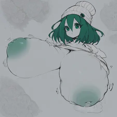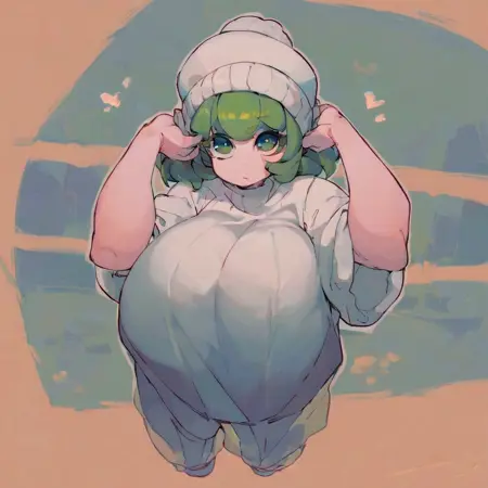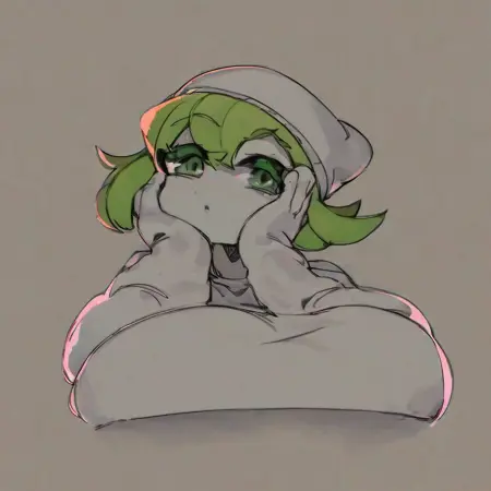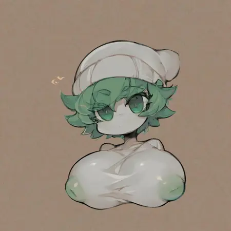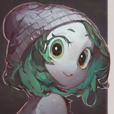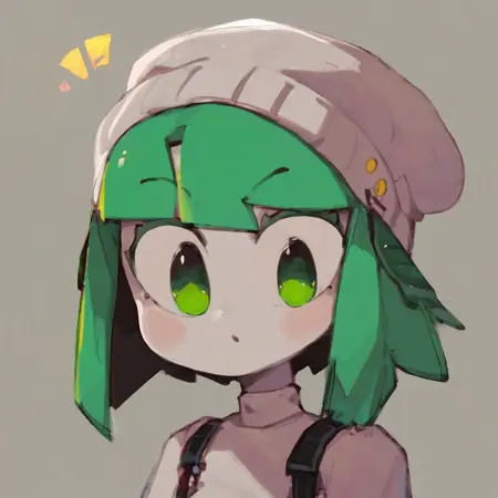 为她的普通外观添加:“女人,女孩,白皮肤,绿眼睛,白色针织帽,白色帽子,白色衬衫,绿发,短发,绿色睫毛,圆头,圆卡通头,机器人,机器人女孩,卡通,卡通女孩,大眼睛,可爱,可爱女孩,圆头,圆卡通头”。