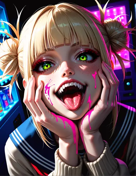 // 面部提示示例 // 圆脸,光滑皮肤,浅桃色肤色,大杏仁形蓝眼,自信的微笑,柔和的红晕,富有表现力的卡通眉毛,长波浪金发,齐刘海,可爱的笑容,动画风格,按钮式眼睛