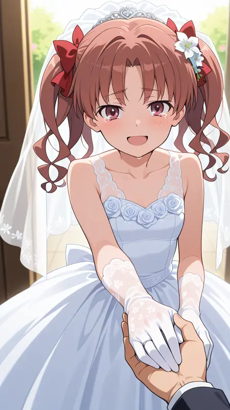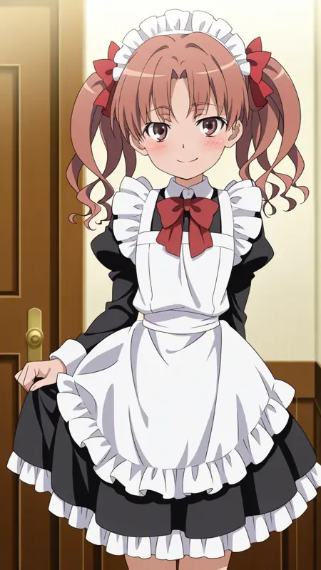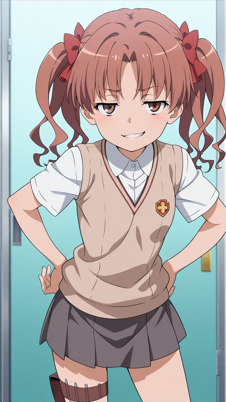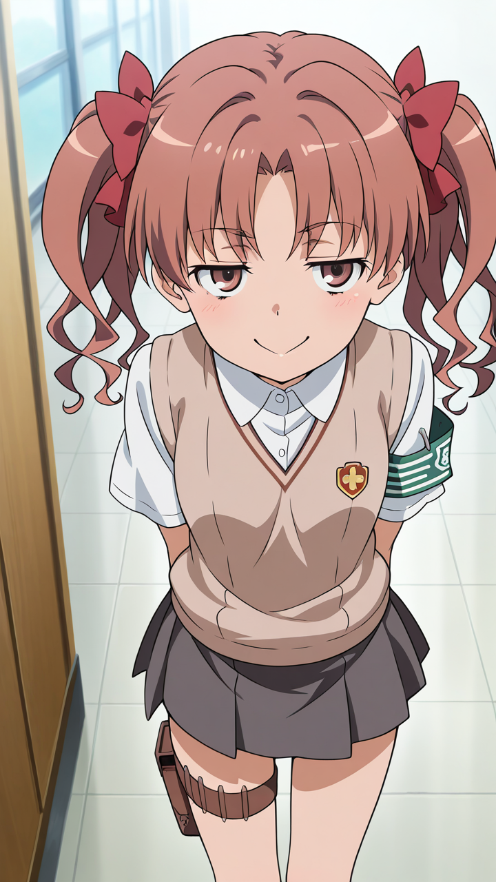 shirai kuroko, twintails, brown hair, red bow, hair bow, hair ribbon, long hair, wavy hair, brown eyes,