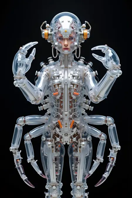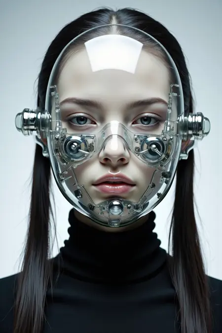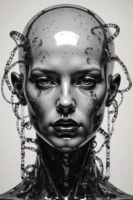 被写体(特に顔や上半身)を、アクリルまたは Plexiglass で注ぎ込まれた、コーティングされた、または完全に封じ込められたような、光沢のある透明または半透明の彫刻に変換します。滑らかな表面、内側の反射、そして微妙な光の屈折が期待できます。