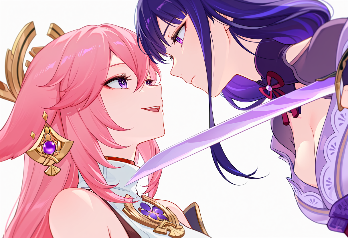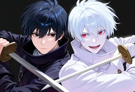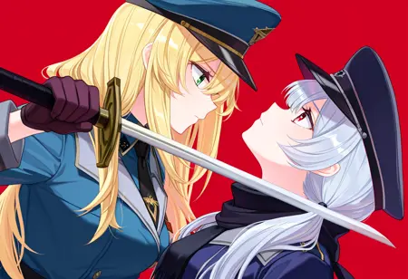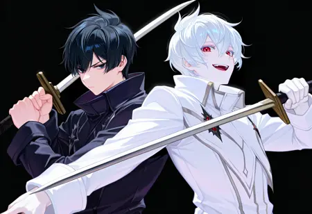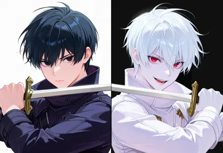 전투: 2명이 필요하며 상체만 포함: 칼을 목에 대기, 칼을 들고 있음, 무기를 들고 있음, 마주 보기, 눈맞춤, 상대방을 바라봄