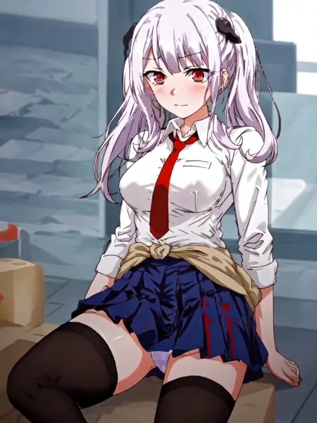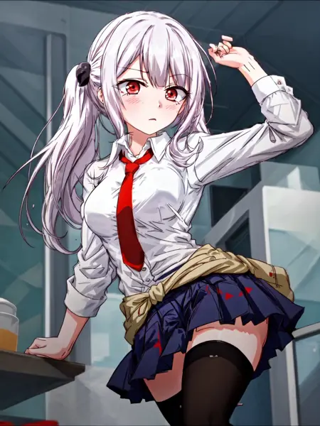 标准服装的关键词集合:AiKitagami, 1girl, solo, breasts, skirt, shirt, red eyes, thighhighs, twintails, school uniform, white shirt, white hair, necktie, red necktie, clothes around waist