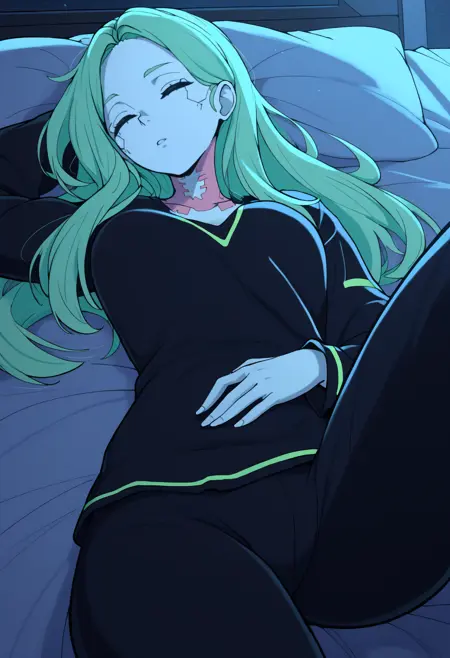 トリガー+外見: reb3cca, サイボーグ, 白い肌, 首のタトゥー, 腹のタトゥー, 足のタトゥー, 長い髪, 緑の髪, ツインテール, 緑の目, 機械の目, 人工の目, 赤い巩膜, 赤い瞳
