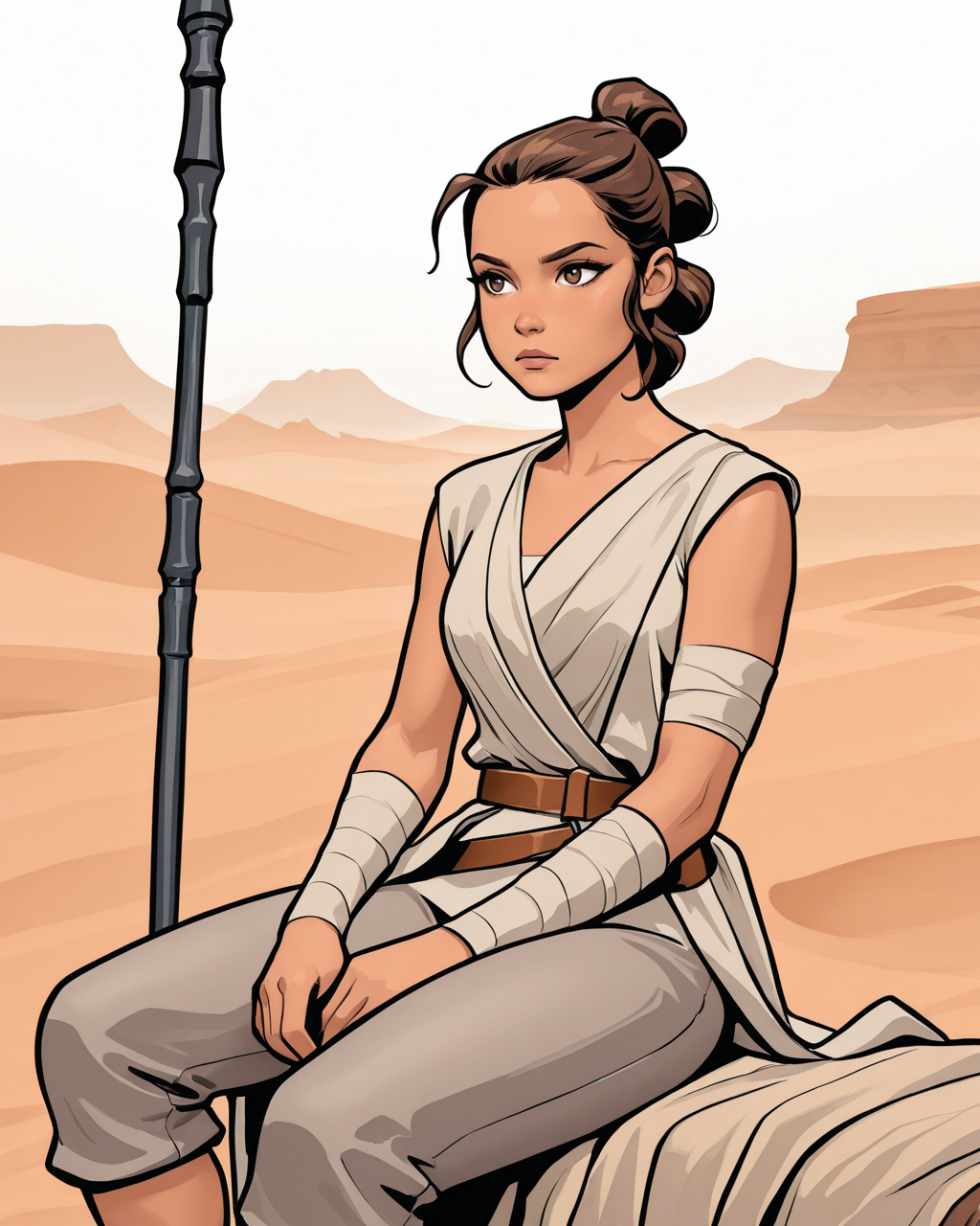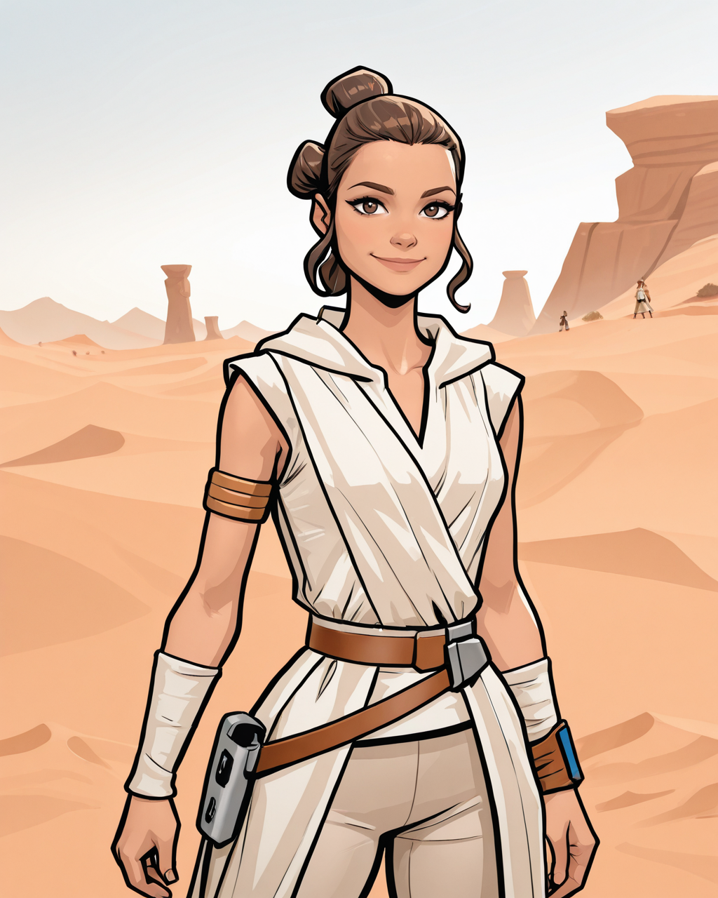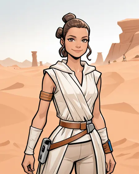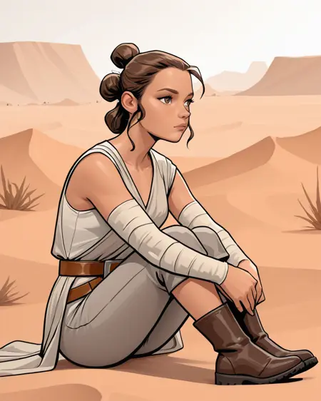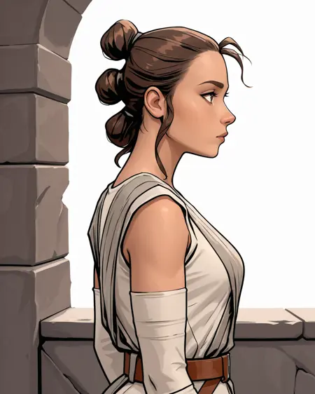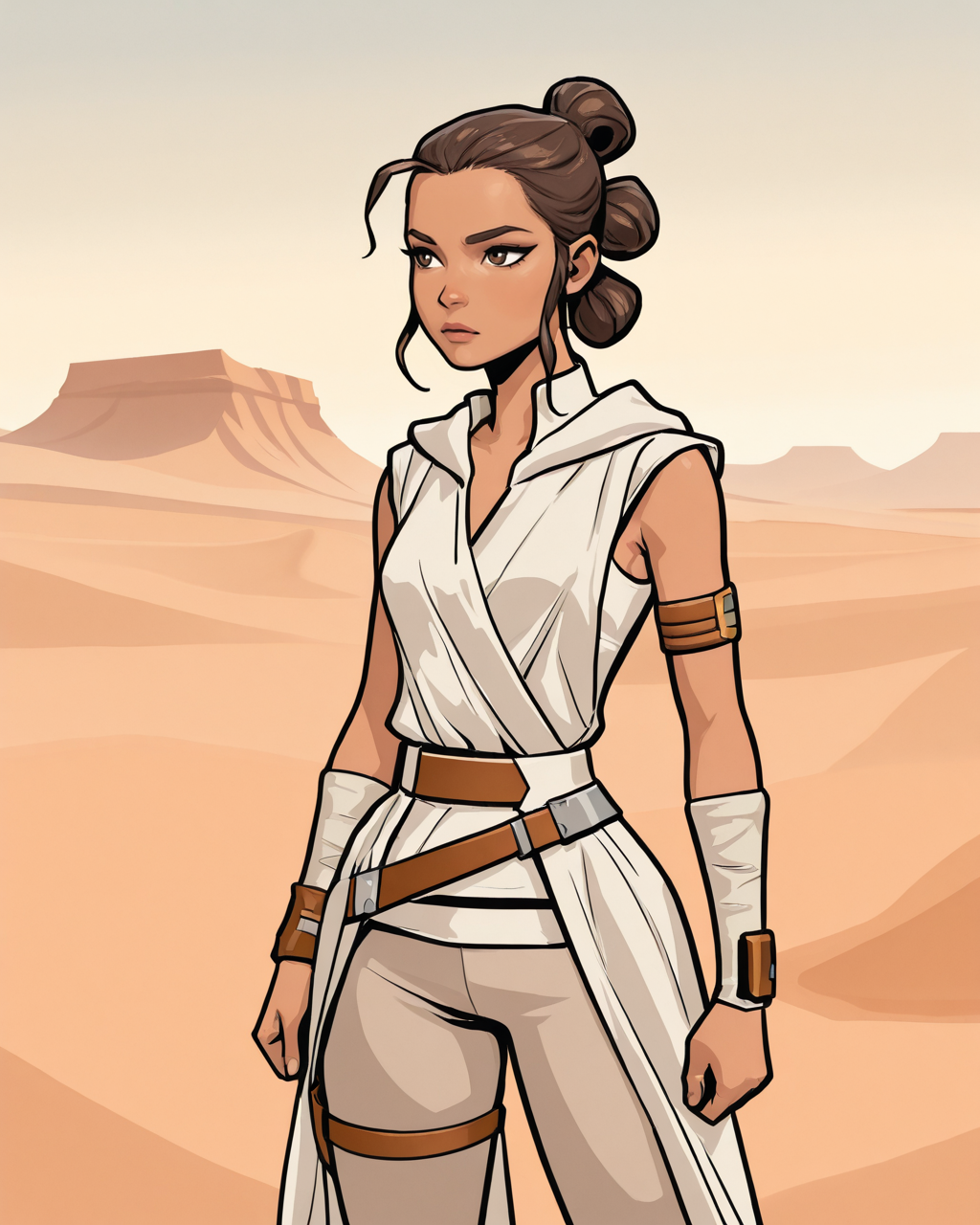 ジェダイ:reycomic、片側の髪、髪の結い、茶色の髪、茶色の目、白いチュニック、ベルト、腕輪、リストバンド、ショートパンツ、ブーツ